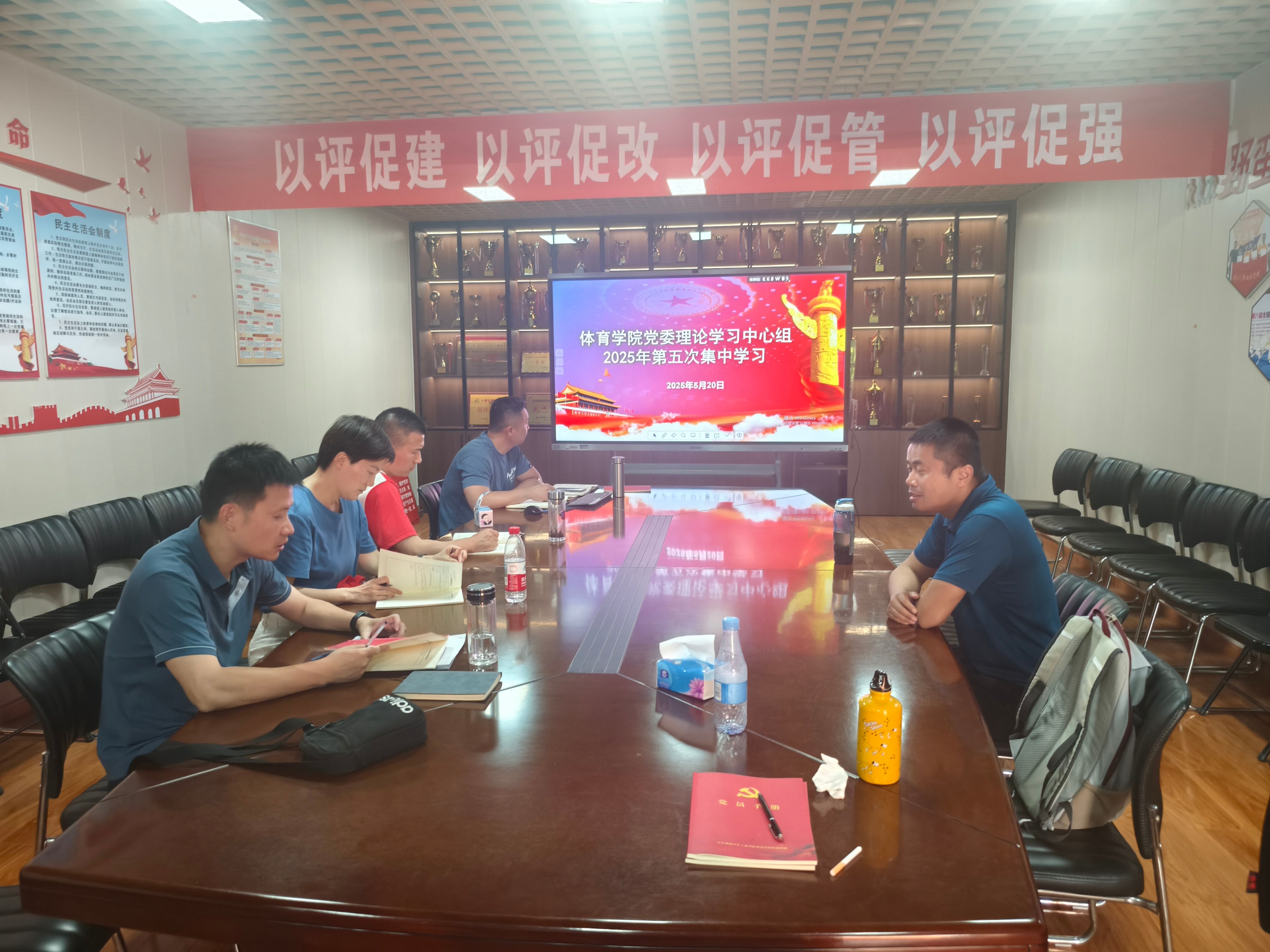 党委在会议室开展5月份政治理论学习中心组学习会,熊玲书记主持会议,党委委员、教研室主任、办公室主任参加了本次学习。