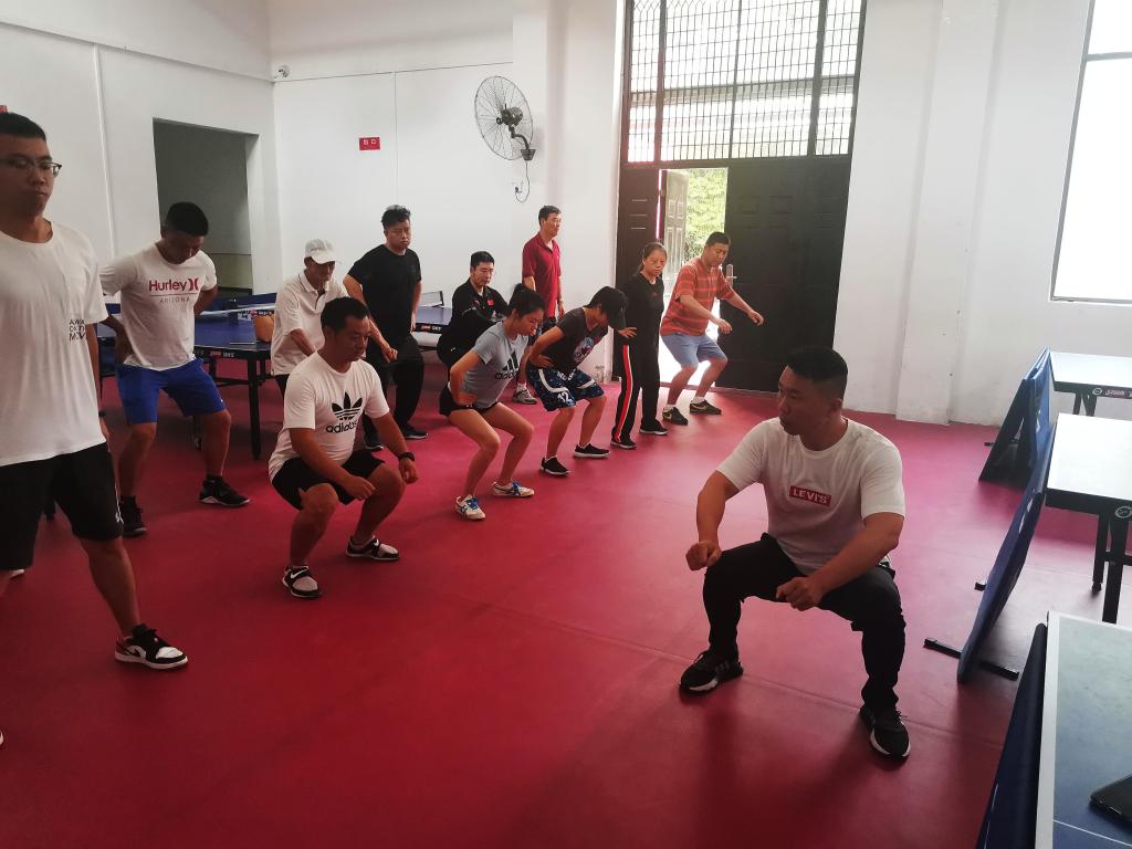 在教研活动中周胜老师从锻炼价值、练习方法、错误动作及纠正方法等方向详细讲解了徒手深蹲、弓箭步、腰腹部及上肢拉伸等身体素质练习方式,并对各位老师提出的疑问一一进行解答。