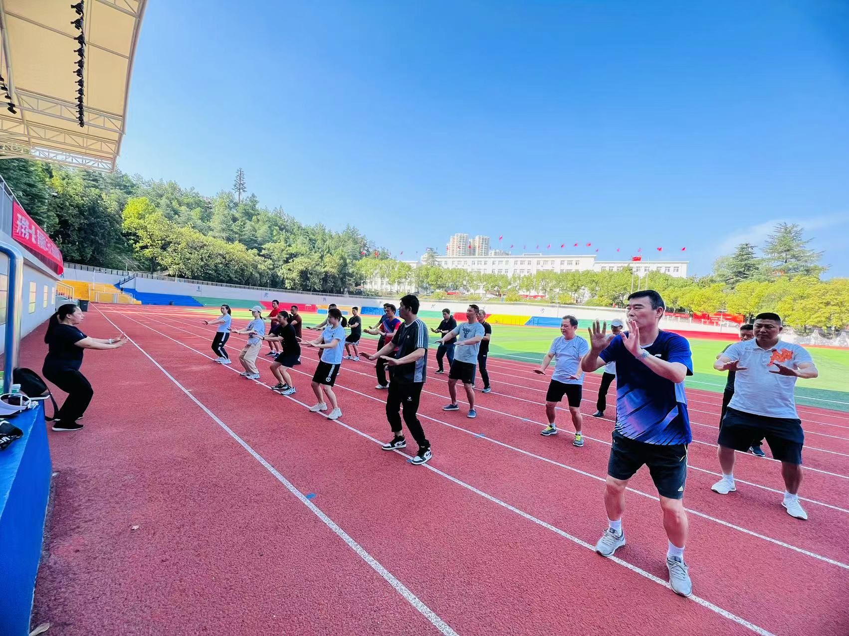 随后陈玲老师带领全体教师练习了本学期一年级课程主要教学内容:武当九式太极拳。陈玲老师从浅到深,详细阐述每个动作标准、手型、步法、身法等,一招一式细致讲解武当九式太极拳的基本原理,示范练拳的方法技巧、动作要领。教师们认真学习,在陈玲老师的悉心带领下纠错、巩固、进步,整齐划一的动作、矫健的身姿彰显了教师们的蓬勃活力。