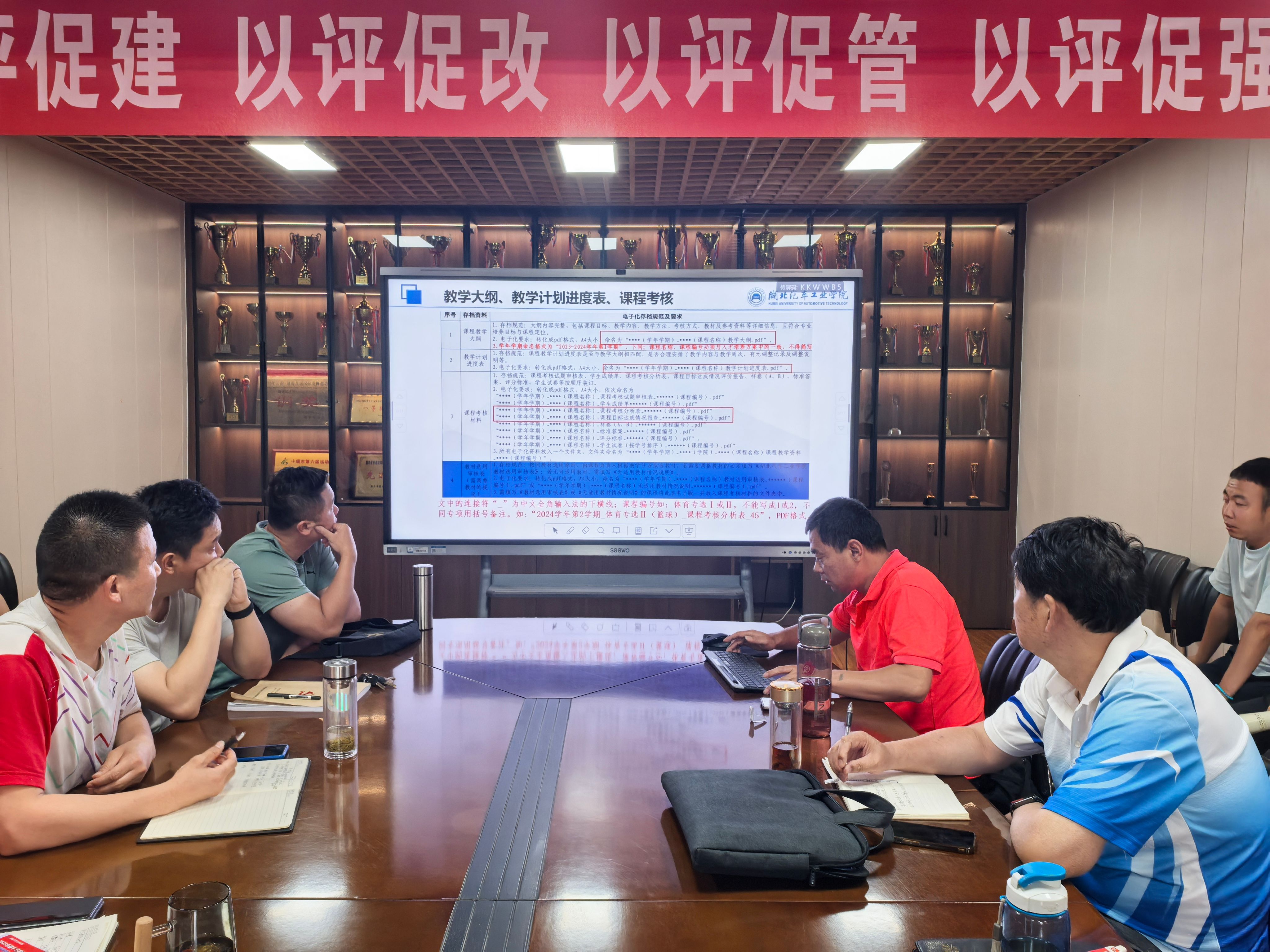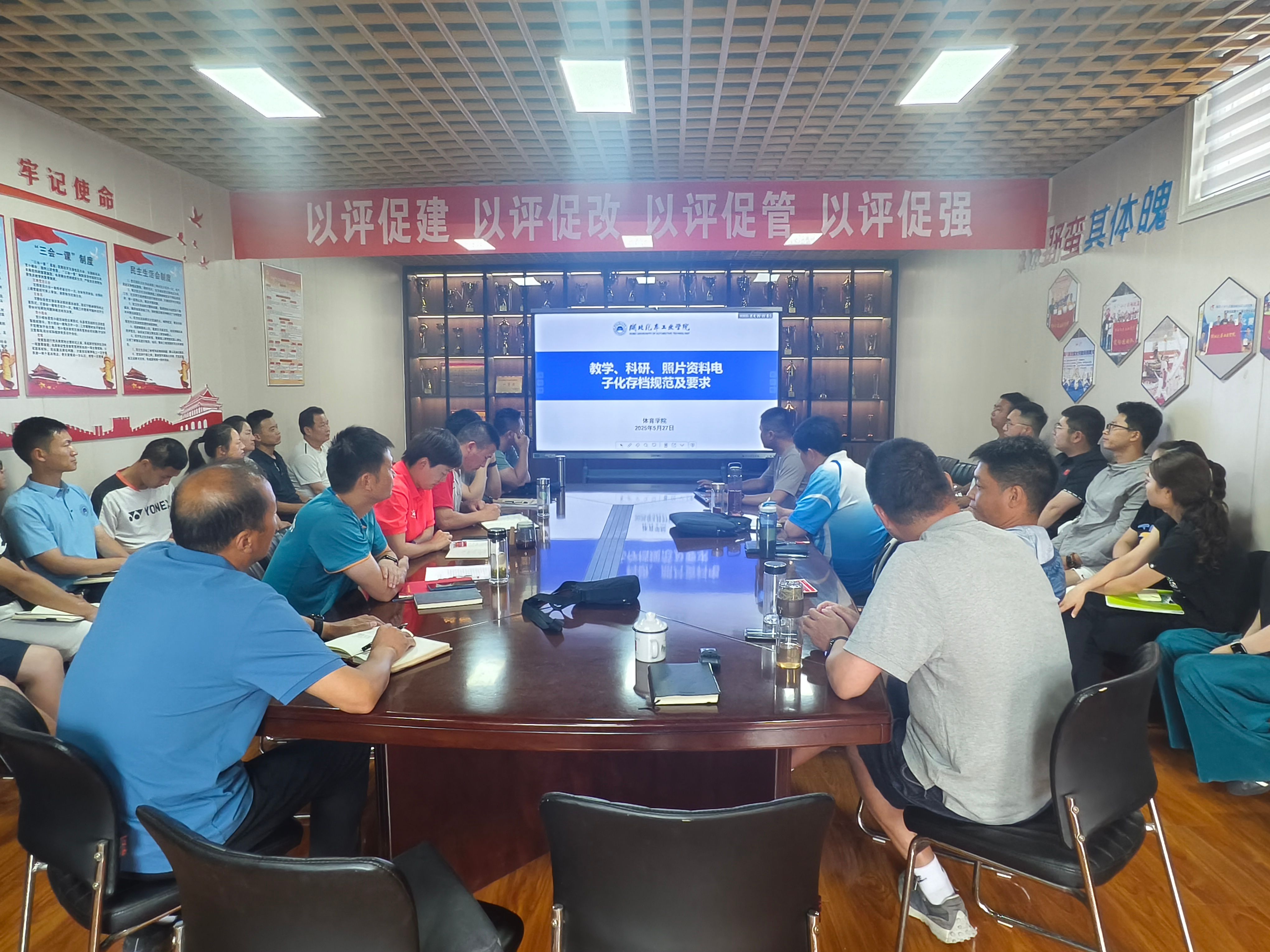 全体教师在会议室参与 “教学资料填写与归档规范讲解” 教学法活动,为学校本科教育教学审核评估蓄力。学校教学督导余超教授参加了本次活动。