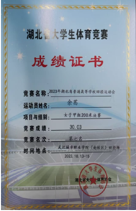 2.2023年湖北省普通高等学校大学生田径运动会甲组200米第七;