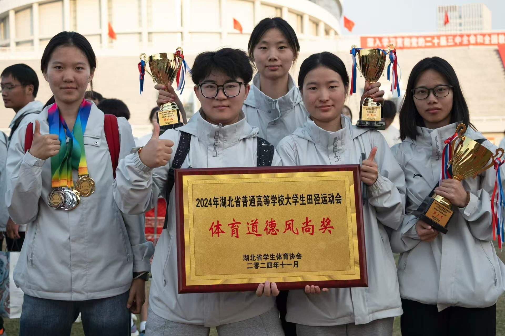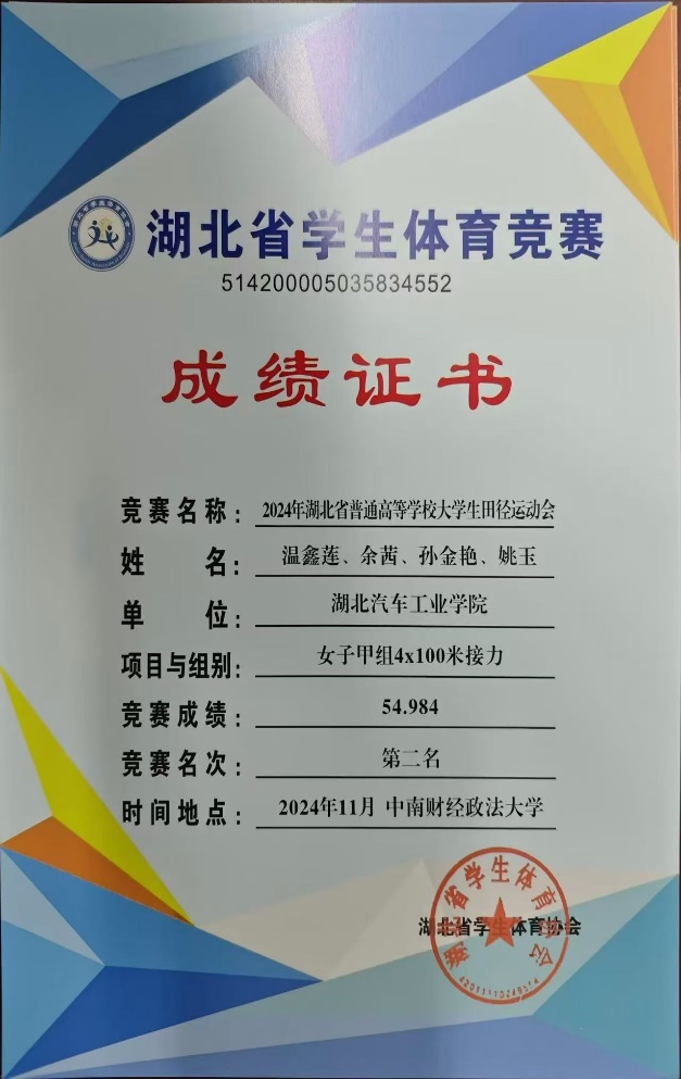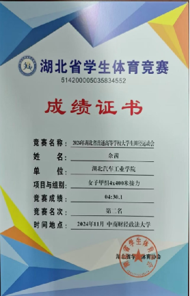 6.2024年湖北省普通高等学校大学生田径运动会甲组4*100米第二(打破校会记录);