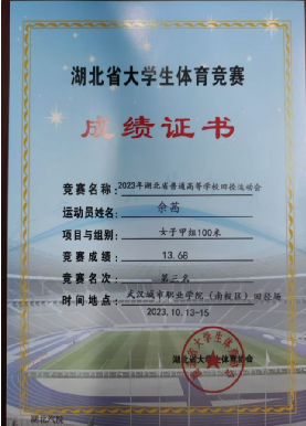 1.2023年湖北省普通高等学校大学生田径运动会甲组100米第三;