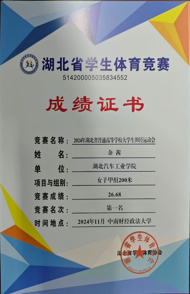 5.2024年湖北省普通高等学校大学生田径运动会甲组200米第一(打破校会记录);