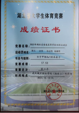 3.2023年湖北省普通高等学校大学生田径运动会甲组4*100米第七;